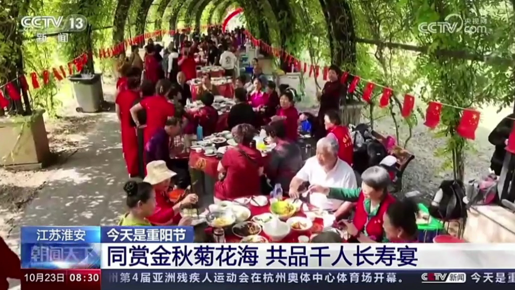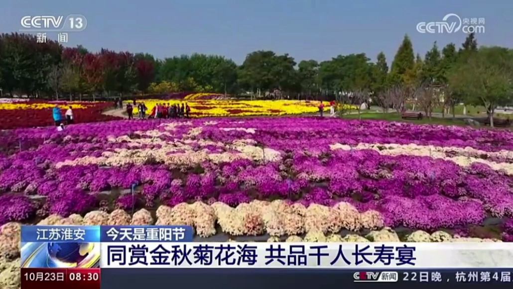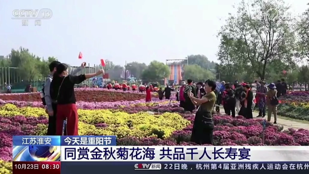 今天是农历九月初九,是我国的传统敬老节日——重阳节,各地通过举办各类活动传承敬老爱老的优良传统,营造良好的社会氛围。九九重阳节是登高望远赏菊的好时节,在淮安白马湖旅游度假区,一年一度的特色菊花展开幕,色彩斑斓、摇曳多姿的菊花,吸引游客纷至沓来。景区还开展“同赏金秋菊花海 共品千人长寿宴”活动,来自湖北、贵州、浙江、上海、江西等地的1500余名老年游客欢聚于此,赏菊花、品美食、观民俗。