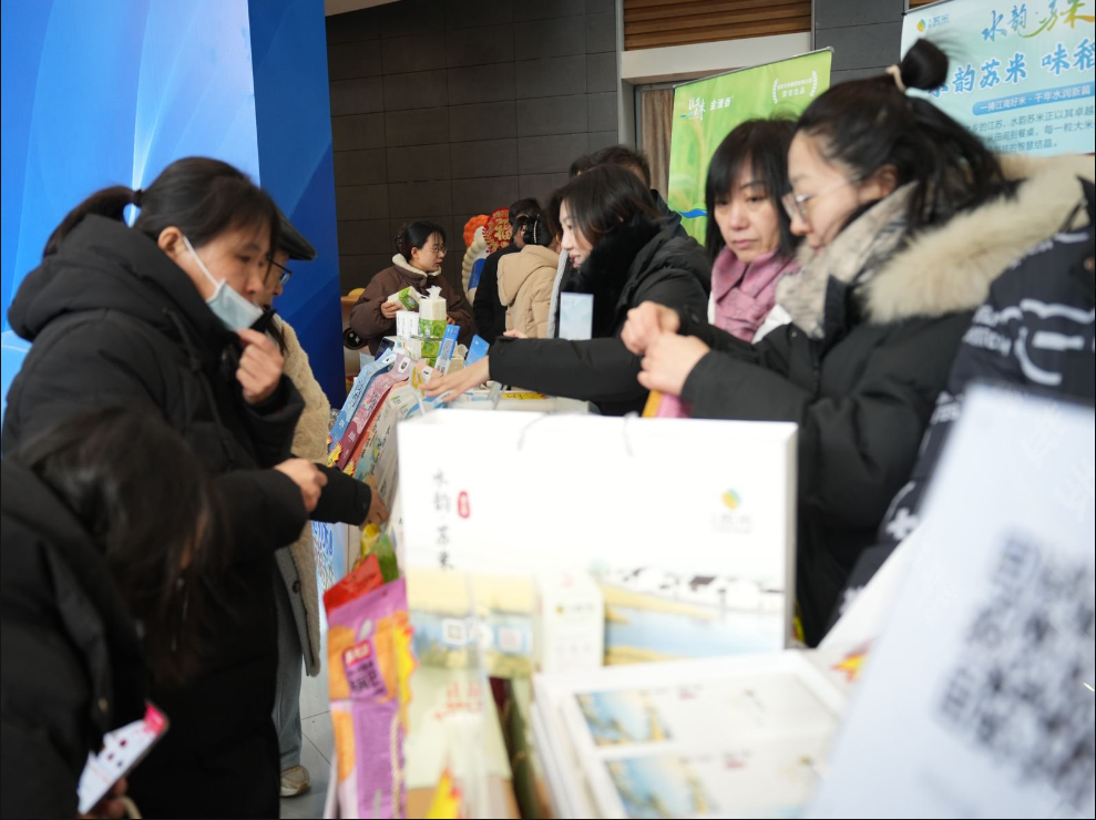 活动现场精彩纷呈,人气火爆。在新华社总社综合楼一楼集中展销区,淮安市文旅集团精心搭建的“淮安风物集市”汇聚了来自运河之畔的优质产品:晶莹软糯的淮安大米、清香甘醇的白马湖金丝皇菊、芡实、黑猪肉制品、现烤现售的黄桥烧饼以及融汇运河故事与巧思的文创产品,深受新华社职工欢迎,销售现场气氛热烈,充分展现了“淮安好物”的受欢迎程度。